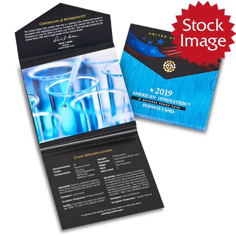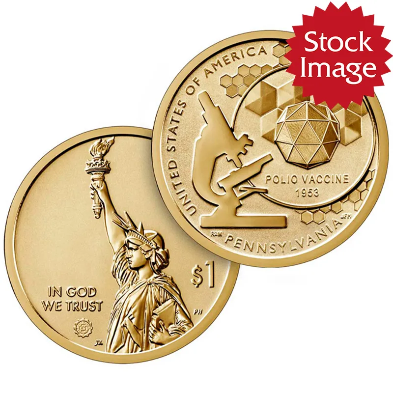 The American Innovation $1 Coin representing Pennsylvania honors the discovery of the polio vaccine in 1953 by Dr. Jonas Salk and his team.
