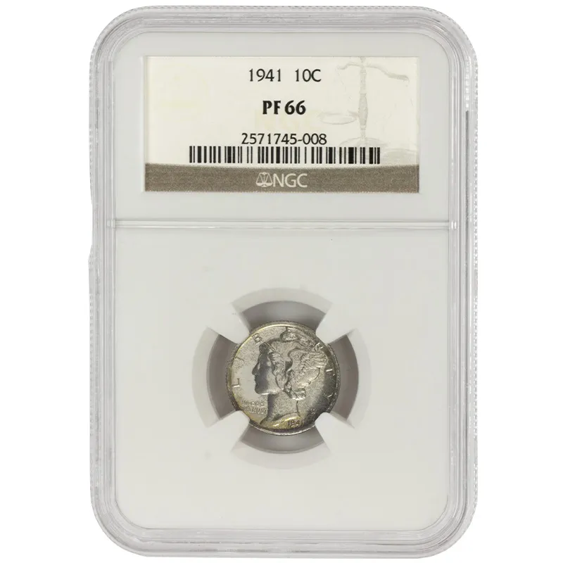 Discover the beauty and historical significance of the 1941 Mercury Dime, graded NGC PF66. This exceptional coin features the iconic designs of Adolph A. Weinman, showcasing Liberty in full splendor, adorned with her signature winged cap symbolizing freedom and mental agility. The reverse displays a striking depiction of a fasces and an olive branch, representing strength and peace. With its high proof designation of PF66 from the prestigious Numismatic Guaranty Corporation (NGC), this Mercury Dime exemplifies brilliant luster and remarkable detail, making it a valuable addition for both serious collectors and numismatic investors. Don't miss the opportunity to own a piece of American history that continues to captivate enthusiasts across generations!