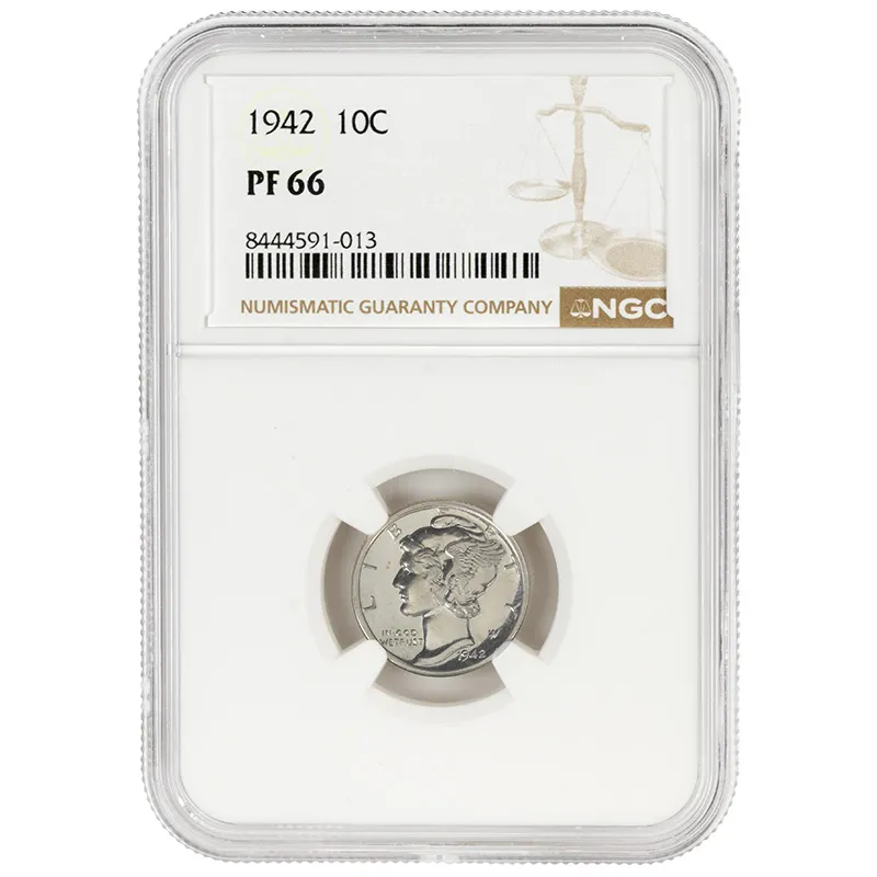 Explore the exquisite 1942 Mercury Dime, graded NGC PF66, a true gem for collectors and investors alike. This beautiful coin showcases exquisite craftsmanship and the iconic design by Adolph Weinman, marking it as a standout piece in American numismatics. The reverse features a detailed depiction of a fasces and olive branch, symbolizing strength and peace. With its stunning proof finish, this Mercury Dime shines brilliantly, capturing the interest of those who appreciate historical significance and artistry in coin collecting. Add this extraordinary 1942 Mercury Dime to your collection today and celebrate a piece of American history that continues to captivate coin enthusiasts.