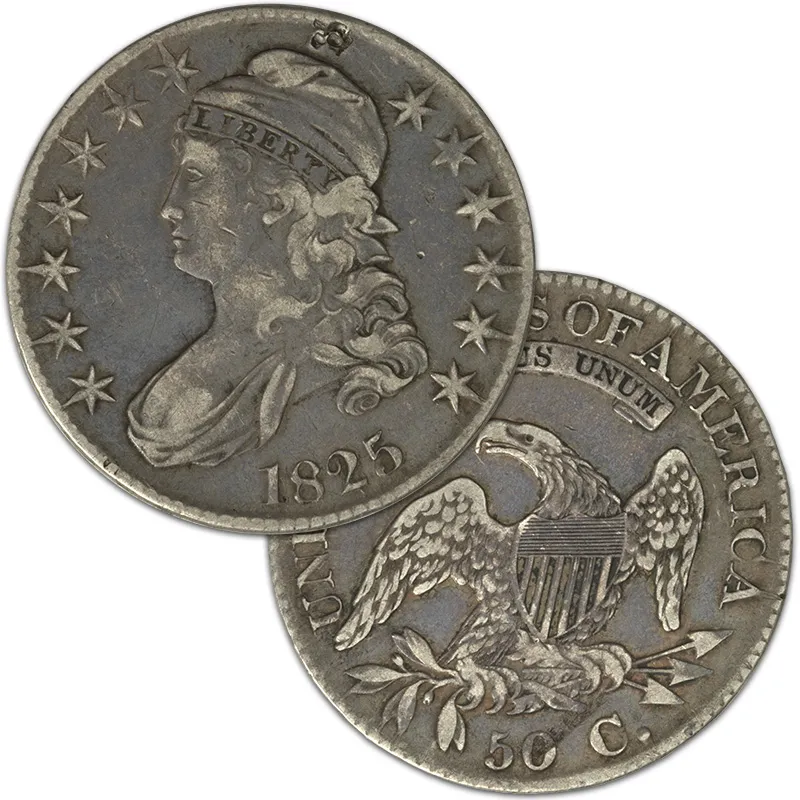 Discover a remarkable piece of American history with the 1825 Capped Bust Half Dollar in Very Fine condition. This stunning coin features the iconic Capped Bust design, crafted during a pivotal moment in U.S. numismatic history. The obverse showcases the elegant portrait of Lady Liberty adorned with a classic cap, symbolizing freedom and patriotism. On the reverse, the heraldic eagle proudly clutches arrows and an olive branch, representing strength and peace. With a rich history dating back to the early 19th century, this 1825 half dollar is not only a valuable collectible but a significant artifact reflecting the artistry and craftsmanship of its time. Ideal for both seasoned collectors and new investors looking to enhance their portfolios, this coin represents a unique opportunity to own a piece of America's monetary heritage. Add this Capped Bust Half Dollar to your collection today and celebrate the captivating story behind this classic American coin.