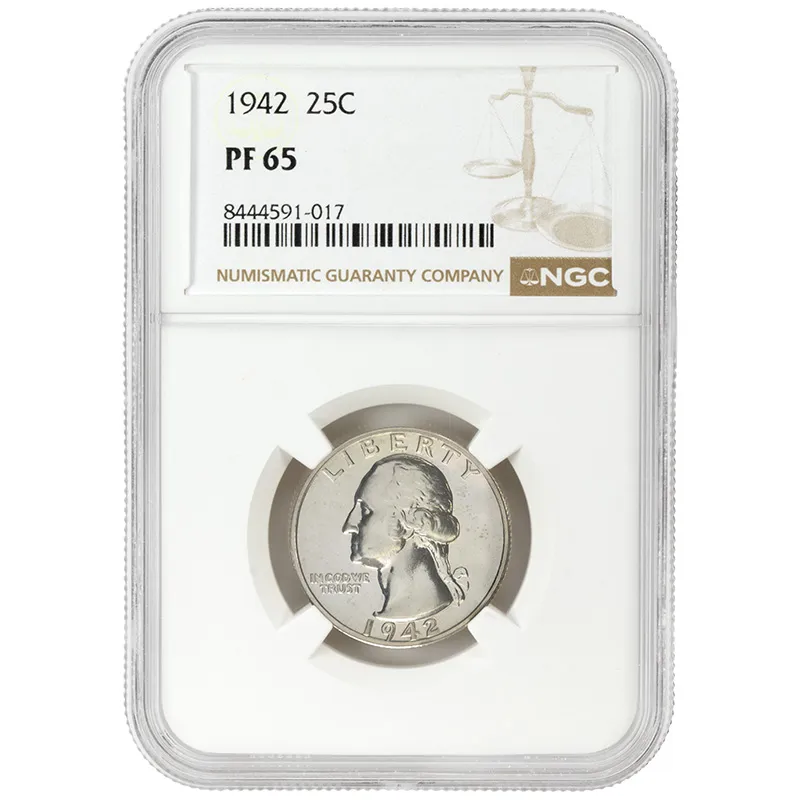 Presenting the 1942 Washington Quarter, a remarkable piece of American history, graded NGC PF65, perfect for numismatic enthusiasts and collectors alike. Minted during a pivotal year in World War II, this quarter features the iconic portrait of George Washington, designed by John Flanagan, on the obverse, and a majestic eagle on the reverse, symbolizing American resilience and strength. The PF65 grade attests to its exceptional quality, showcasing the striking detail and brilliant luster that coins of this caliber are known for. Add this exquisite example of the 1942 Washington Quarter to your collection, and celebrate not only the artistry of American coinage but its rich heritage that has stood the test of time. Ideal for investors seeking a high-quality addition to their portfolio or collectors aiming for completeness in their Washington Quarter series.