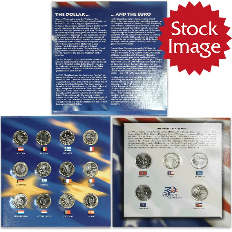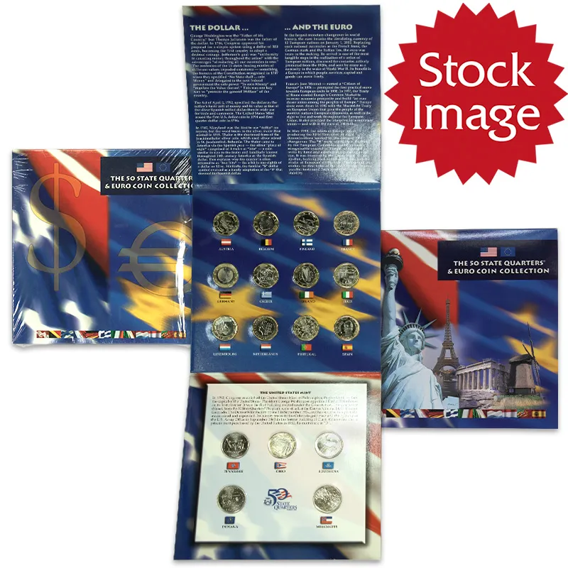 Discover a unique fusion of currency with our 2002 50 State Quarters & Euro Coin Collection. This exquisite set features 12 authentic Euro coins issued by the 12 founding nations of the European Union, alongside 5 commemorative State Quarters minted in 2002.