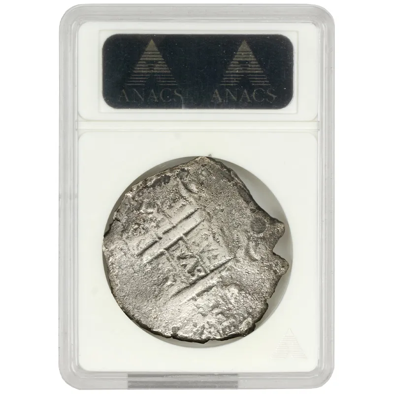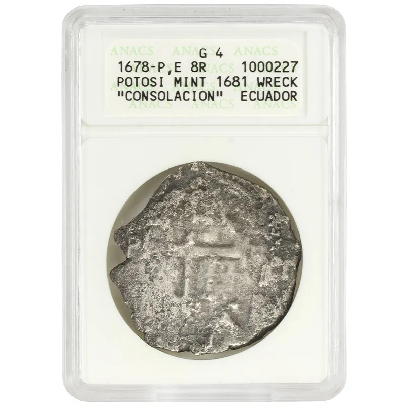 Discover a remarkable piece of history with this 1678 Spanish 8 Reales coin minted in Potosi, salvaged from the fabled Consolacion shipwreck. Graded ANACS G4, this coin offers a fascinating glimpse into the maritime history of the Spanish colonial period. Known for its significant role in trade, the 8 Reales coin, often referred to as the "piece of eight," was a standard currency used around the world. This particular coin showcases wear consistent with its time at the bottom of the sea, making it a treasured collectible for numismatists and history enthusiasts alike. Whether you're looking to enhance your coin collection or invest in a piece of history, this Spanish 8 Reales is a must-have addition. Don't miss out on this unique opportunity to own a fragment of the past!