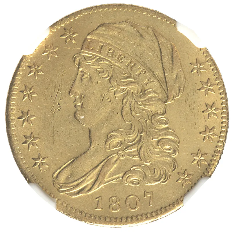 Discover a rare gem from American numismatic history with this 1807 Busted Left $5 Gold Coin, certified and graded as MS 61 by NGC (Numismatic Guaranty Corporation). This stunning piece features the classic bust design, showcasing the artistry of early American coinage. The 'Bust Left' variety is particularly sought after by collectors due to its unique historical significance and limited mintage. Its impressive MS 61 grade reflects its well-preserved condition, making it an ideal investment for both seasoned collectors and newcomers. This coin not only serves as a valuable addition to any portfolio but also celebrates a pivotal moment in U.S. history with its striking design and gold composition. Don’t miss the chance to own a piece of this remarkable legacy!