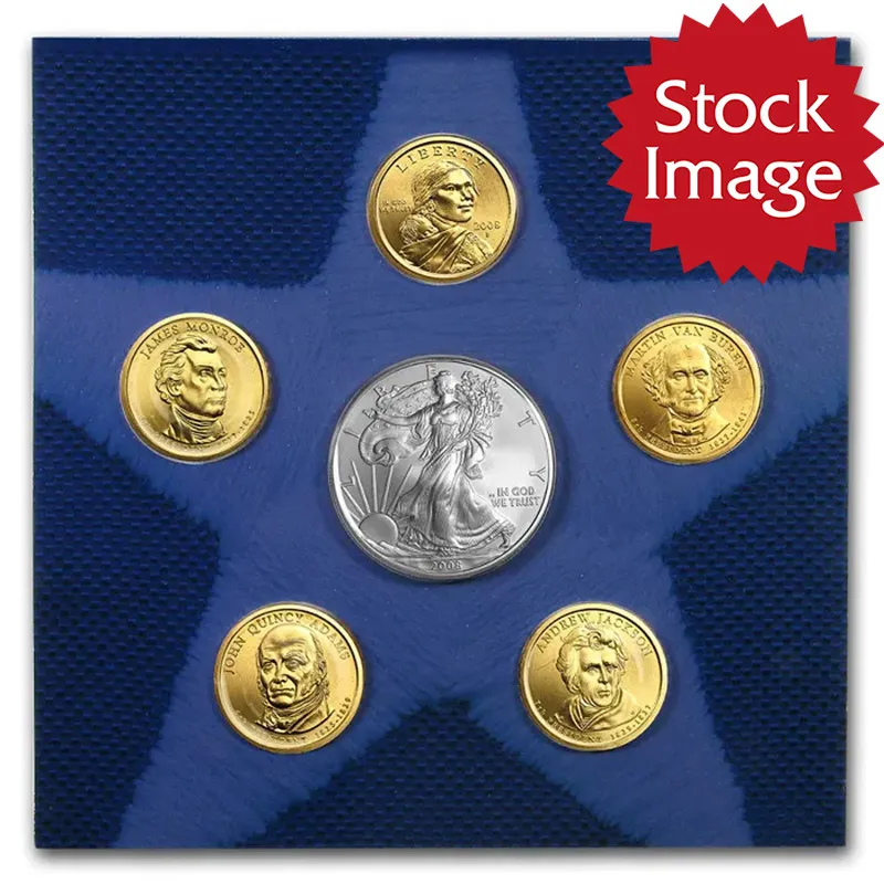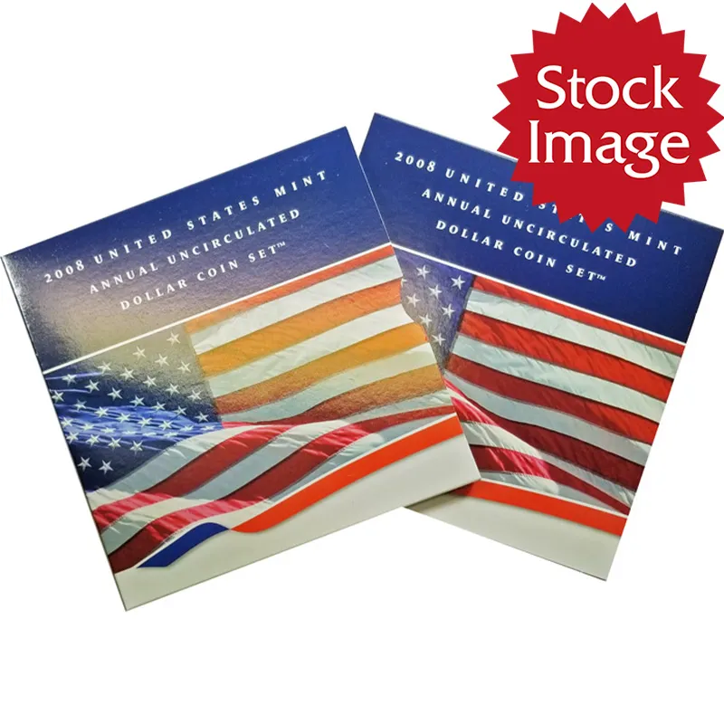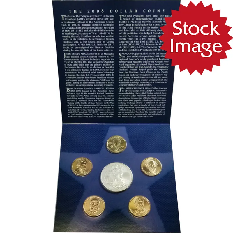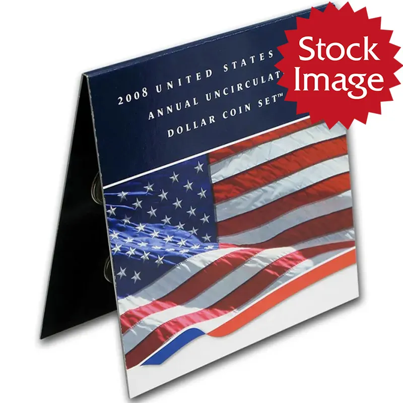 The 2008 Annual Uncirculated Dollar Coin Set contains all of the dollars for this year. These sets come packaged in a folder with each coin wrapped in a clear plastic pouch that can be rotated to make sure you coins can be rotated to the proper directions for display.