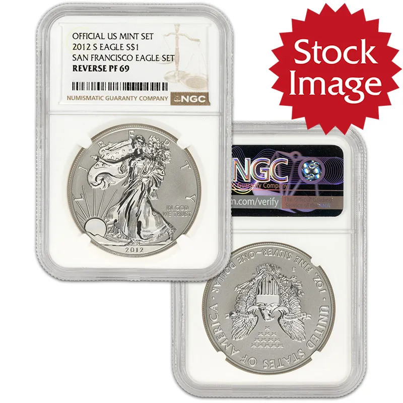 Discover the exquisite 2012 S American Silver Eagle, graded as Reverse Proof 69 by NGC. This stunning bullion coin is a must-have for avid collectors and investors alike. Struck at the San Francisco Mint, the 2012 S American Silver Eagle features a beautifully detailed design that showcases the iconic Walking Liberty on the obverse and a majestic eagle on the reverse. With its high-quality reverse proof finish, this coin boasts a mirror-like background and frosted design elements, making it a striking addition to any numismatic collection. Don't miss your chance to own this prestigious piece of American coinage, celebrated for its artistry and intrinsic silver value.
