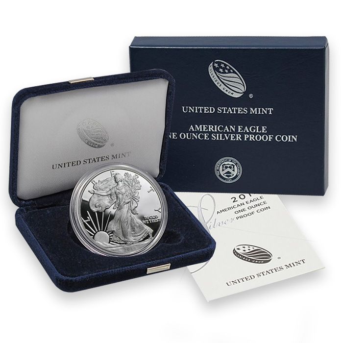 These American Eagle Silver Proof dollar coins have been produced each year by the United States government mint since 1986.  Considered by many to be one of the most beautiful American coin designs, it is modeled after the old Walking Liberty half dollars.  Each official US proof issued dollar coin contains 1 ounce of pure silver.  Each proof coin comes in the official government issued velvet lined gift box along with the original certificate of authenticity (COA) or insert card.