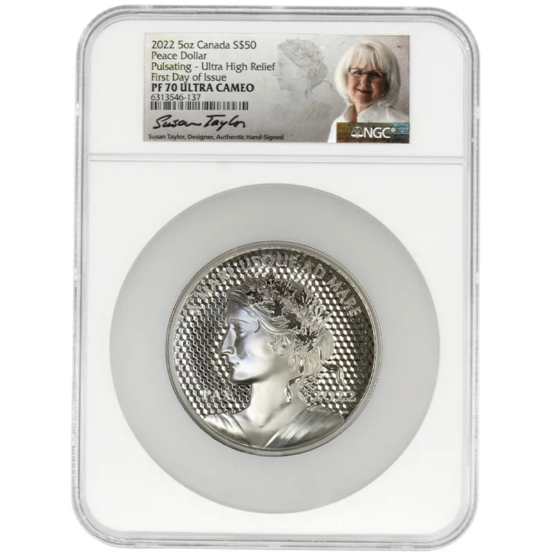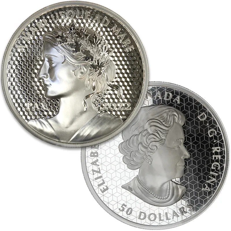 Explore the 2022 Canada $50 Silver Peace Dollar, a stunning piece of numismatic art crafted from 5 ounces of .9999 fine silver. This exquisite bullion coin commemorates the enduring symbol of peace and is a must-have for collectors and investors alike. The 2022 edition continues the legacy of the iconic Peace dollar, blending both historical significance and modern artistry in its design. With its impressive weight and purity, this coin not only exemplifies Canada's dedication to fine craftsmanship but also serves as a valuable addition to any silver investment portfolio. Secure your 2022 Canada $50 Silver Peace Dollar today and own a piece of history.