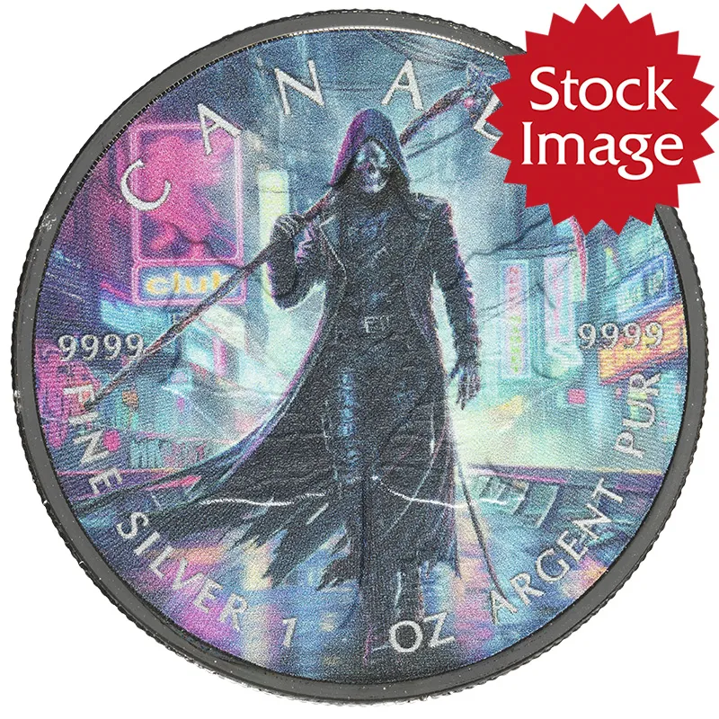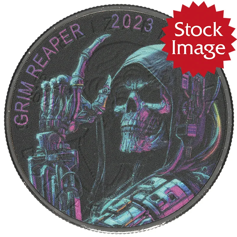 Discover the captivating beauty of the 2023 Canada $5 Silver 1oz Grim Reaper - Colorized Coin. This remarkable numismatic piece features a striking depiction of the Grim Reaper, masterfully crafted in 1 ounce of .9999 fine silver, and enhanced with vibrant colorization and a sleek black ruthenium finish.