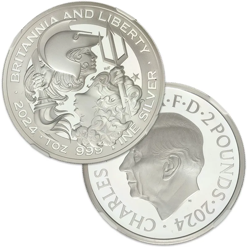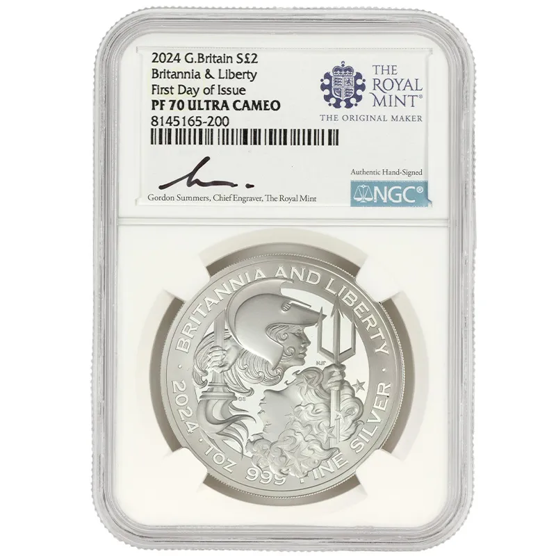 Discover the stunning 2024 Britannia & Liberty 1st Day of Issue 1 oz Silver Coin, graded NGC PF70 Ultra Cameo. This exquisite coin commemorates the rich heritage of both the British and American numismatic traditions, showcasing the iconic designs of Britannia and Lady Liberty. Each coin is struck with meticulous attention to detail, ensuring perfect minting quality as reflected in its PF70 designation. Adding this collectors' item to your portfolio not only enhances your collection but also serves as a remarkable investment in precious metals. Secure this limited edition release and celebrate the legacy of coinage with this exceptional piece.
